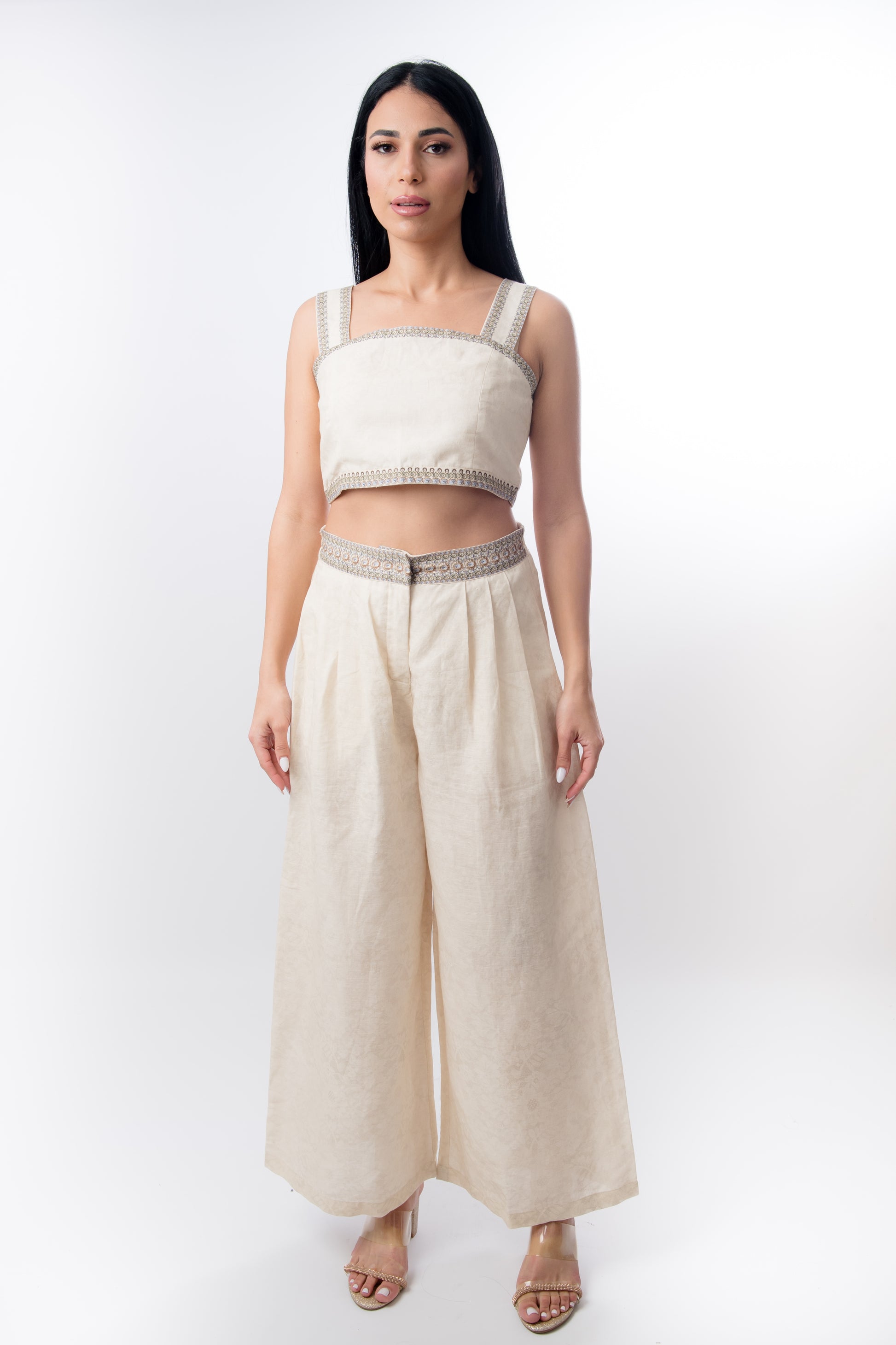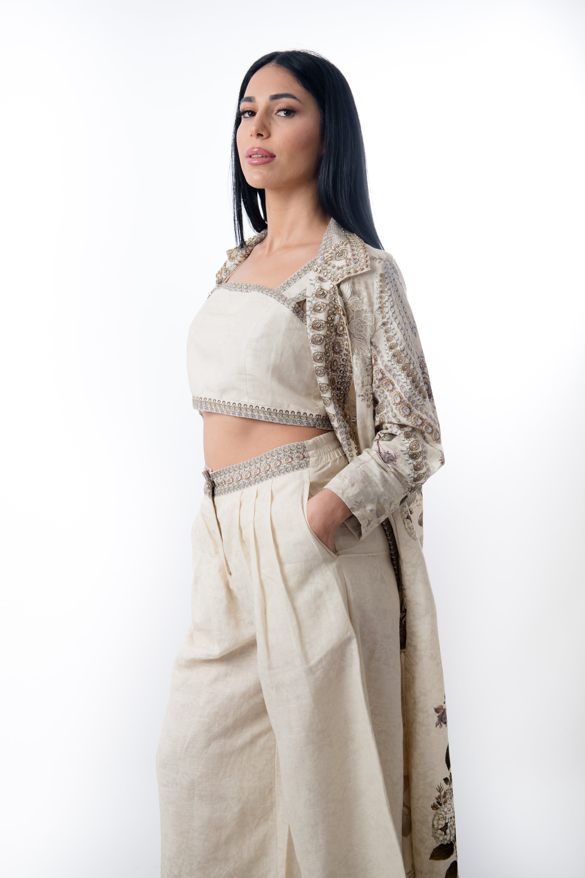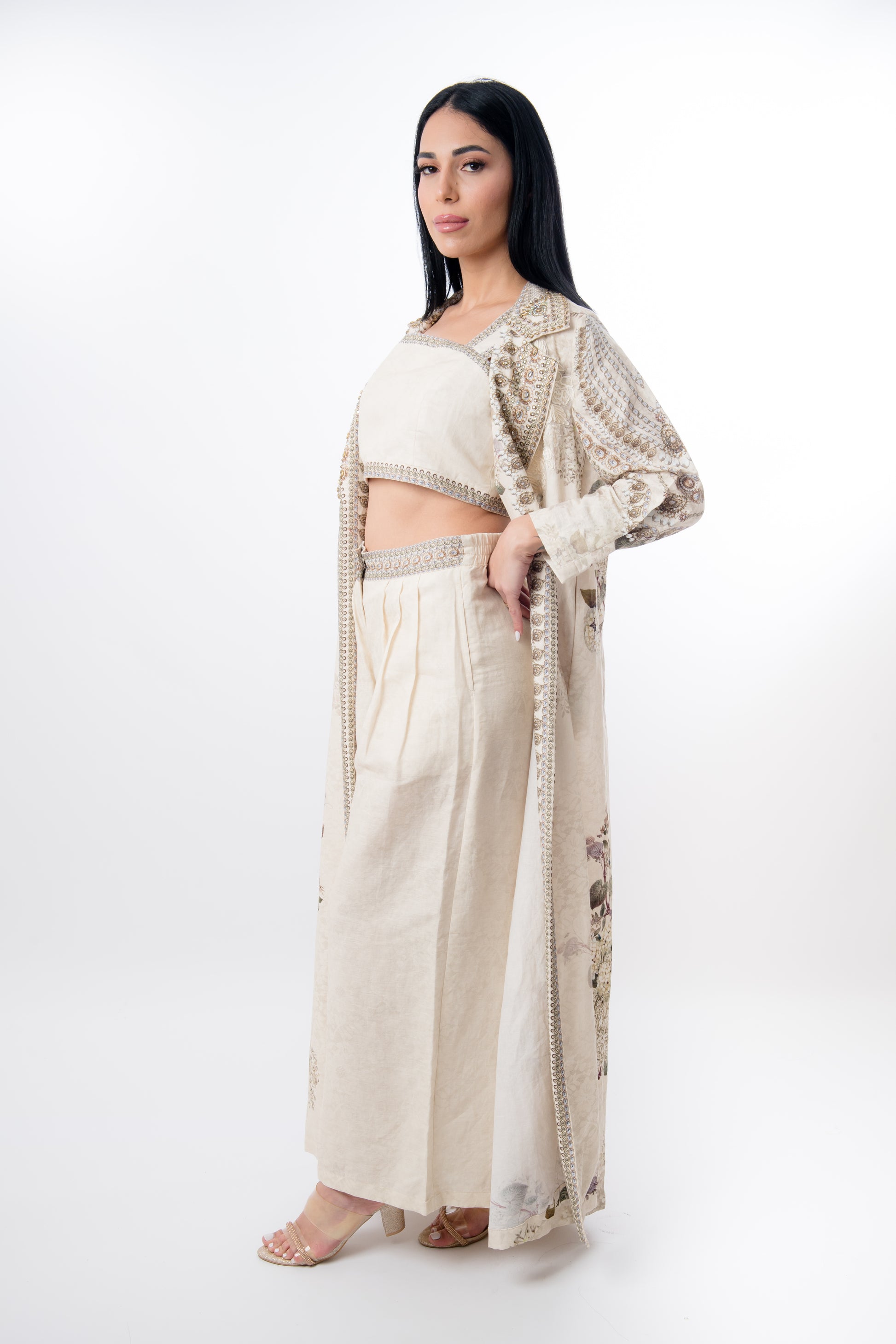 Contemporary three-piece set with crop top, wide-leg pants, and embellished long jacket
